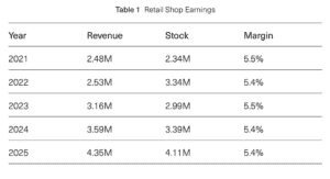 From 2021 to 2025, revenue grew from BDT 2.48 million to BDT 4.35 million, a 75% increase. However, profitability did not improve as stock purchases increased proportionally, leaving the profit margin at 5.4%-5.5%.