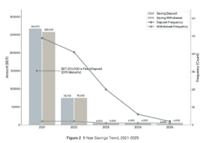 Aamir regularly saved in a Deposit Pension Scheme (DPS) at a commercial bank and a co-operative bank. His DPS matured into a significant lump sum in 2021, which he reinvested into a fixed deposit. However, over the last five years, his liquid savings have considerably decreased due to rising household expenses, including the medical costs of his father’s terminal illness and his children’s education. Figure 2 depicts five years of savings deposits and withdrawals, with transaction amounts shown as bars and frequencies as lines.