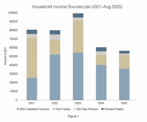 Her income, while steady, remains vulnerable to shocks. Yet her resourcefulness and energy is remarkable. By maintaining multiple income sources, such as birth assistance, livestock rearing, and a government pension, she manages to live independently while continuing to support pregnant women in her community.