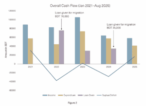 These deficits resulted mainly from howlats (interest-free loans) Rasiya gave to family members. In 2022, she extended howlats totaling BDT 76,000, and in 2024, another BDT 35,000, primarily to her sons and grandsons to support their overseas migration. To fulfill their travel, Rasiya sold livestock and used her savings to meet family expectations.